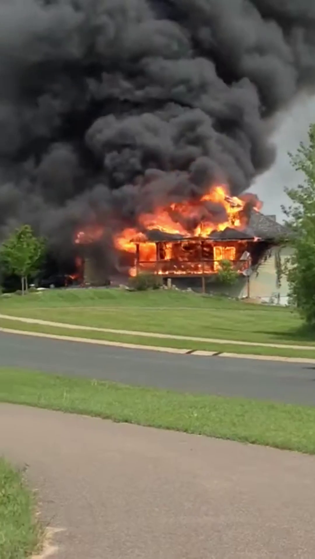 Gusting Winds: Weather conditions at the time of the fire are compounding the hazard. Strong, gusting winds are actively pushing the immense heat and flames toward the neighboring structure. Fire crews were immediately forced to deploy a high-volume water line solely to wet down the exposed side of the adjacent house in an attempt to create a buffer and prevent the intense radiant heat from igniting the second building.