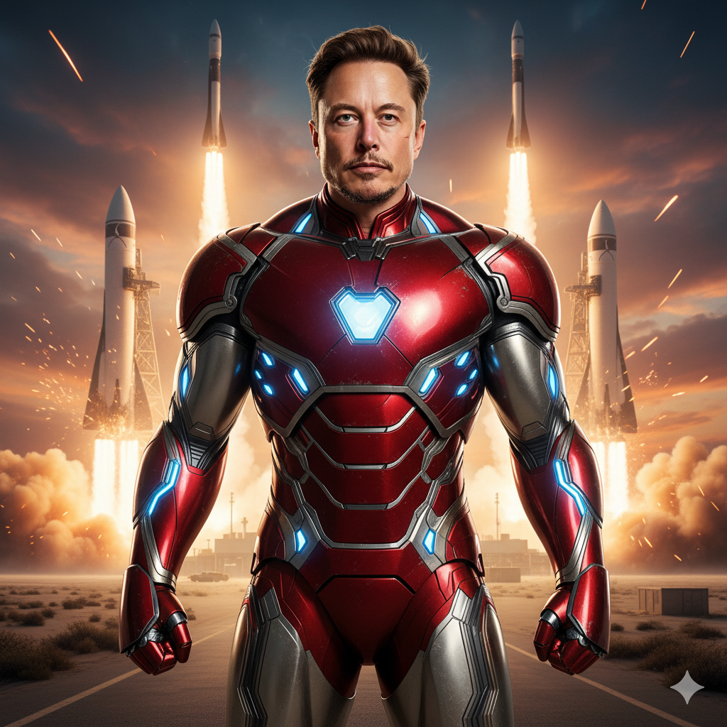 The idea of Musk as Iron Man is unexpected, playful, symbolic. It taps into pop culture and wonder.