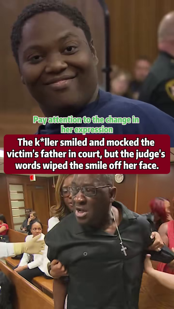In a courtroom charged with unbearable tension, where grief collided with justice and every eye was fixed on the woman accused of committing an unspeakable crime, a chilling moment unfolded that left the entire room stunned, as the convicted killer, seated in chains and awaiting her sentencing, turned her head toward the grieving father of her victim and, in a gesture that cut like a knife, smiled mockingly, her lips curling into a smirk that seemed to revel in cruelty, provoking gasps from those present and tears of rage from a family already broken by loss; the father, his body trembling, had moments earlier delivered a victim impact statement that poured raw emotion into the courtroom, recounting the agony of losing his child, the sleepless nights haunted by nightmares, and the unfillable void left in his heart, his voice cracking as he begged the court to impose the harshest penalty allowed by law, but even his courage could not shield him from the taunting smirk of the woman who had stolen his child’s life, a gesture that for many crystallized the depravity and lack of remorse that had defined her throughout the trial; reporters noted the audible sobs and shouts from the gallery as deputies quickly positioned themselves, fearing an outburst from the father or others, but before the situation could escalate, the judge, a seasoned jurist known for his firm command of the courtroom, leaned forward, his eyes fixed on the defendant with a cold, unflinching stare, and delivered words that would pierce through the facade of arrogance she had displayed for months, words that cut through her smile and left her face drained of its mocking bravado; in a voice heavy with both authority and condemnation, the judge recounted the overwhelming evidence of her guilt, the cruelty of her actions, the devastation inflicted upon an innocent family, and the utter absence of humanity she had shown not only in her crime but in her conduct during the proceedings, making clear that her attempt to mock a grieving father would not sway the scales of justice, but rather serve as further proof of her character and her danger to society; as the sentencing was handed down—life behind bars without the possibility of parole—witnesses described the transformation in her demeanor as immediate and striking, her smirk evaporating into a pale, tight-lipped expression, her eyes darting as if searching for an escape from the reality that she would never again walk free, never again manipulate or mock her way through life, and in that instant, the power dynamic shifted entirely, the woman once capable of inflicting terror reduced to silence under the weight of accountability; the father, though still devastated, was seen nodding slowly, his eyes wet with tears but his lips whispering words of gratitude toward the bench, knowing that while his daughter’s life could never be restored, justice at last had been served, and the killer’s cruel smile had been silenced; outside the courthouse, emotions overflowed as community members embraced the victim’s family, reporters clamored for statements, and legal experts weighed in on the unusual but powerful exchange that had defined the closing moments of the trial, many remarking that the killer’s smile may go down as one of the most haunting courtroom images in recent memory, a stark reminder of evil’s ability to flaunt itself even in the halls of justice, but also a testament to the resilience of victims’ families and the power of the judicial system to respond with finality; the case, which had already attracted national attention due to its disturbing details, now spread further across headlines and social media, with images of the courtroom scene circulating widely, sparking conversations not only about the crime itself but also about the strength required for victims’ families to confront those responsible, and the way judges and courts must balance impartial justice with acknowledgment of raw human suffering; psychologists analyzing the scene noted that killers who display smugness or mockery in court often do so as a means of exerting control, attempting to provoke emotional responses from victims’ families as a way to maintain a sense of power, but that such behavior can backfire when met with firm, authoritative condemnation, as it did here, leaving the perpetrator stripped of the very control she sought to wield; for the community still grieving the young life that had been cut short, the sentencing marked both an ending and a beginning—an end to the trial that had consumed their thoughts and prayers, and the beginning of a long journey toward healing, though the scar of what had happened would never fully fade, a permanent reminder of the precious life taken far too soon; vigils have already been planned to honor the victim’s memory, with candles, prayers, and pledges that her light will not be forgotten, that her name will be spoken for generations as a reminder of both tragedy and resilience, while her father has vowed to dedicate his life to advocacy, ensuring that others who face such devastating losses know they are not alone and that justice, though sometimes slow, can prevail; and so, in that courtroom where a killer once smiled in cruelty, it was ultimately the judge’s voice—measured, steady, and unyielding—that carried the final word, erasing her smirk, ending her arrogance, and sealing her fate, a moment that will be remembered not only as the conclusion of a painful trial but as a powerful example of justice rising above cruelty, of dignity defeating mockery, and of a grieving father standing tall even in the face of unimaginable loss.
